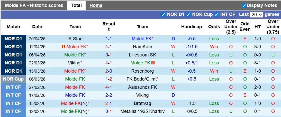 Thống kê phong độ 10 trận đấu gần nhất của Molde