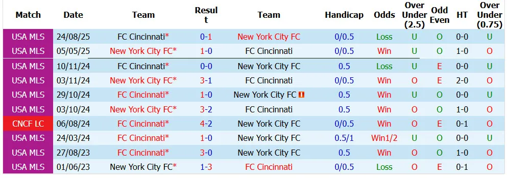 Trong 5 trận đối đầu gần đây giữa New York City và Cincinnati, có đến 4 trận không có quá 2 bàn thắng được ghi mỗi trận. Trận sân khách gần nhất của Cincinnati đã kết thúc với tỷ số hòa 1-1 và về xỉu 2 1/2.