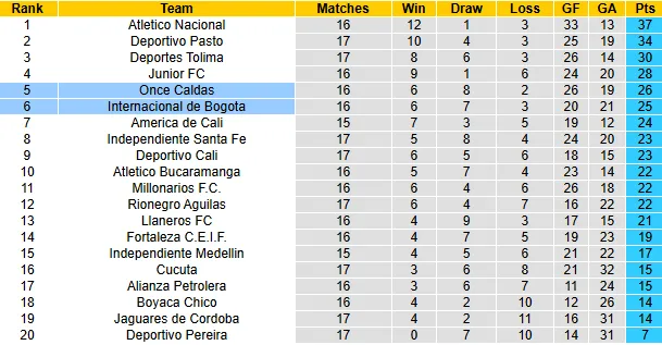 Dưới sự dẫn dắt của HLV Hernan Dario Herrera, Once Caldas đã có chuỗi 7 trận liên tiếp không thua trước Internacional de Bogota (4 thắng, 3 hòa). Tâm lý thoải mái cùng sự phấn khích sau chiến thắng 1-0 ở lượt đi trên sân khách chính là lý do để Once Caldas tự tin hướng tới việc giành trọn 3 điểm.