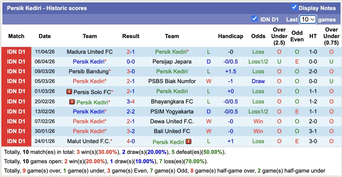 – Thống kê phong độ 10 trận gần nhất của Persik Kediri