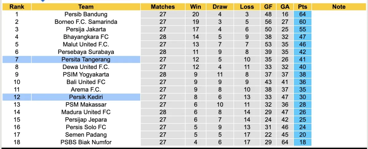 Persita Tangerang đã trải qua 2 chiến thắng liên tiếp nhưng bất ngờ sa sút với 2 trận thua gần đây. Tuy nhiên, đội bóng này vẫn đứng thứ 7 trên bảng xếp hạng với 41 điểm, kém nhóm tham dự AFC Challenge League 6 điểm.