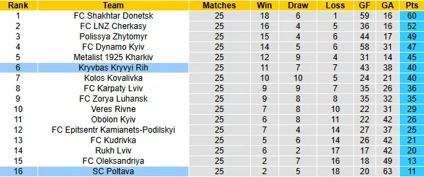 Ngược lại, Kryvbas Kryvyi Rih lại có một mùa giải tương đối ổn định khi đang đứng ở vị trí thứ 6 với 40 điểm. Mặc dù phong độ gần đây có phần không ổn định, nhưng khả năng tấn công của họ vẫn vượt trội so với đội chủ nhà với 43 bàn thắng ghi được (gấp đôi Poltava).