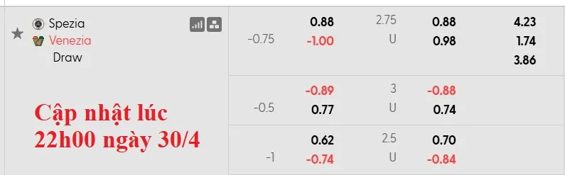 Không chỉ đứng cuối bảng, Spezia còn là đội có số trận thắng kèo châu Á thấp nhất Serie B với chỉ 9 trên 36 trận từ đầu mùa. Trong khi đó, Venezia đã có 21 trận thắng kèo, đứng thứ 3 trong giải đấu. Đội khách đáng tin cậy với mức chấp 3/4.