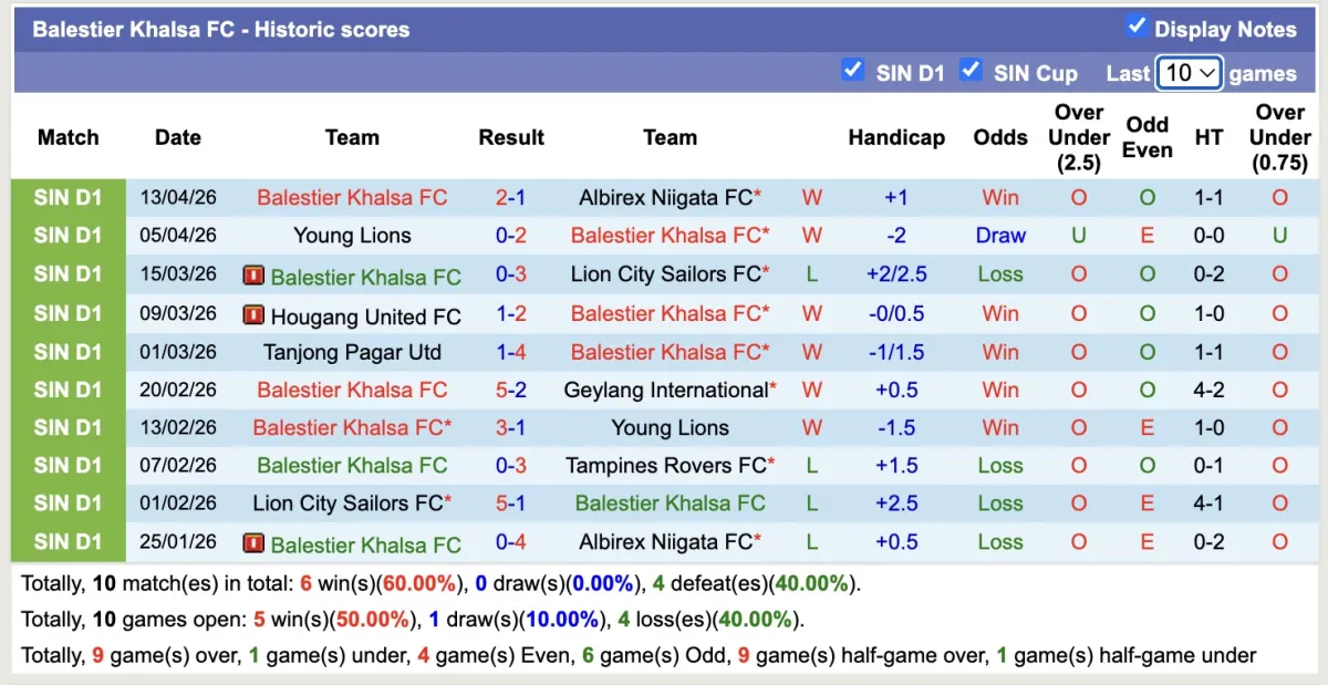 – Thống kê phong độ của Balestier Khalsa trong 10 trận gần nhất