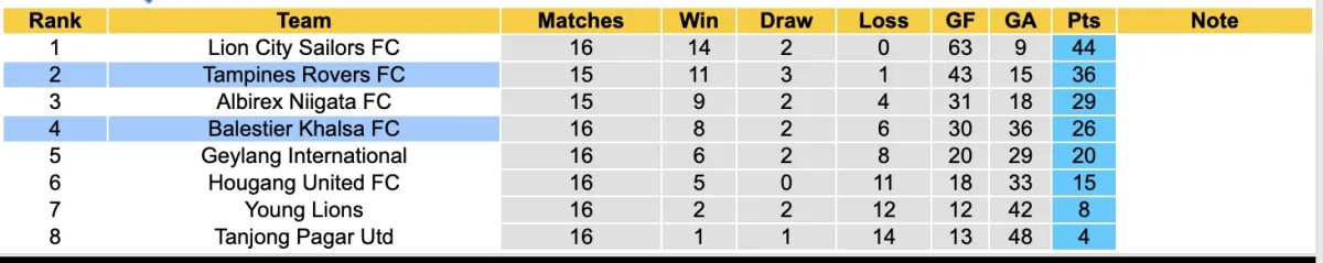 Ngược lại, Balestier Khalsa đã trải qua 6 trận thua liên tiếp trong mùa giải này ở mọi đấu trường. Tuy nhiên, họ đã có sự cải thiện đáng kể khi giành được 6 chiến thắng trong 7 vòng đấu gần nhất tại giải VĐQG Singapore. Hiện tại, họ đang đứng ở vị trí thứ 4.