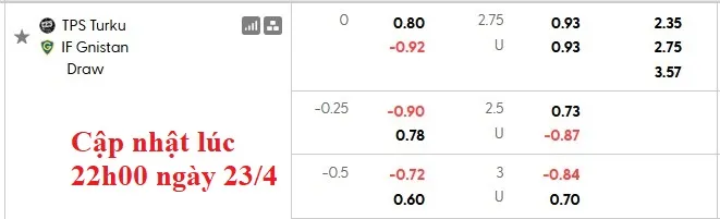 Turun Palloseura đã thắng kèo ở cả 3 trận gần đây tại giải VĐQG Phần Lan, trở thành đội duy nhất đạt tỷ lệ thắng kèo 100%. Trong khi đó, Gnistan chỉ có một lần thắng kèo. Mặc dù kèo châu Á chỉ là 0:0, nhưng đội chủ nhà vẫn được xem là lựa chọn đáng tin cậy.
