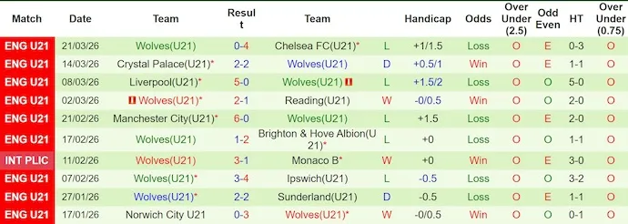 Ngược lại, U21 Wolves đang trải qua giai đoạn khó khăn hơn. Trong 10 trận gần nhất, họ chỉ có 3 chiến thắng, 2 trận hòa và 5 thất bại. Những thất bại nặng nề trước Manchester City U21 và Liverpool U21 cho thấy hàng phòng ngự thường xuyên bị đè nén dưới sức ép lớn.