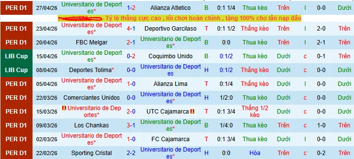 + Universitario đã thua 3 trong 4 trận gần đây theo kèo châu Á.