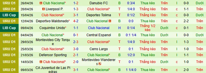 + Club Nacional thắng 3 trong 4 trận mới nhất trên sân khách theo kèo châu Á.