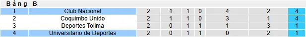 Đội bóng đến từ Uruguay khởi đầu giải đấu với phong độ tốt hơn nhiều. Trong trận đấu đầu tiên, Nacional đã dẫn trước cho đến phút thứ năm của thời gian bù giờ ở Chile nhưng lại để Coquimbo Unido gỡ hòa. Tuy nhiên, ở lượt trận thứ hai, họ đã không cho Deportes Tolima bất kỳ cơ hội nào và giành chiến thắng 3-1 ngay trên sân nhà. Hiện tại, với 4 điểm, Nacional đang tạm dẫn đầu bảng B.
