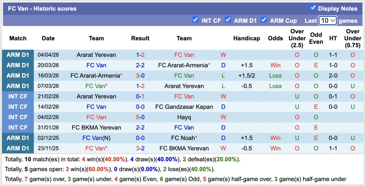 Thống kê phong độ, lịch sử đối đầu của Van với Urartu