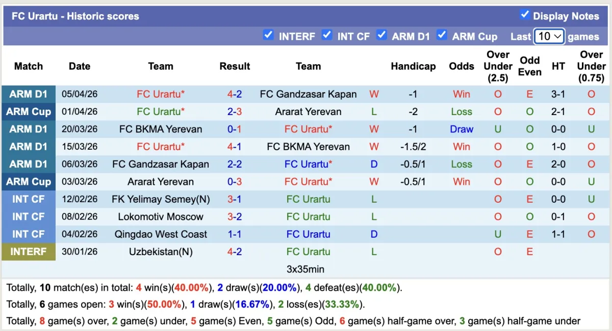 – Thống kê phong độ 10 trận đấu gần nhất của Urartu