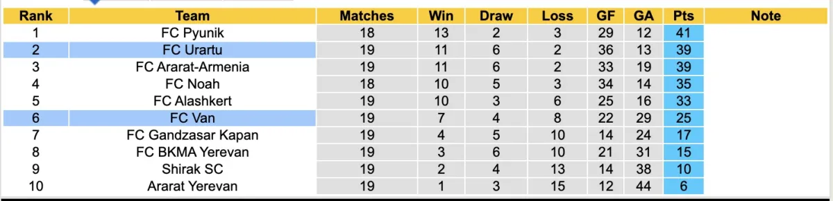 Van dự kiến sẽ phải đối mặt với một thử thách lớn trong trận đấu tới đây trên sân nhà khi chạm trán với Urartu, đội bóng đứng trong Top 3 mùa giải trước. Cần lưu ý rằng trong lần đối đầu gần đây nhất giữa hai đội, Van đã để thua một cách thảm hại với tỷ số 0-4.