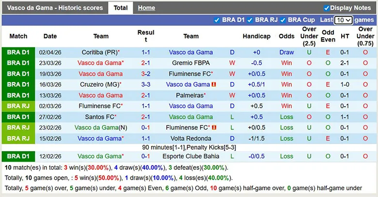 – Thống kê phong độ 10 trận đấu gần nhất của Vasco da Gama