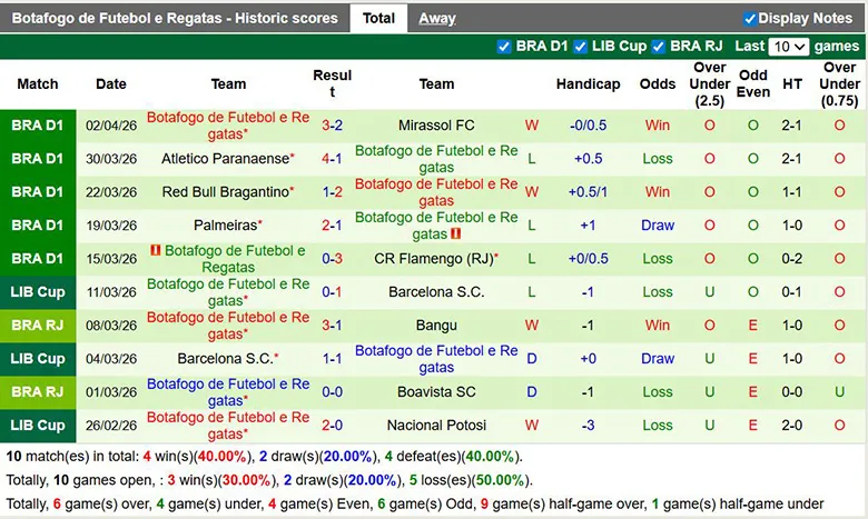 – Thống kê phong độ 10 trận đấu gần nhất của Botafogo