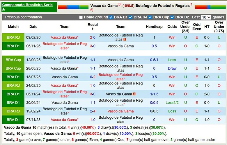Thống kê phong độ, lịch sử đối đầu Vasco da Gama vs Botafogo