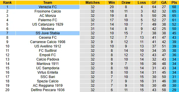 Thống kê phong độ, lịch sử đối đầu Venezia vs Juve Stabia
