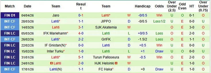 Thống kê phong độ 10 trận đấu gần nhất của Lahti