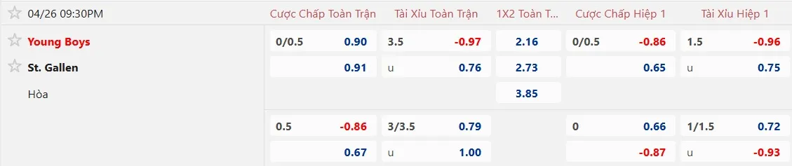 Đội chủ nhà Young Boys đang trải qua chuỗi 4 trận liên tiếp không thắng kèo châu Á, trong đó có 3 thất bại và 1 kết quả hòa. Ngược lại, St. Gallen đang có phong độ tốt hơn với việc thắng kèo châu Á trong 3/4 trận đấu gần đây, đồng thời họ cũng đã thắng kèo 2/3 trận đối đầu gần nhất.