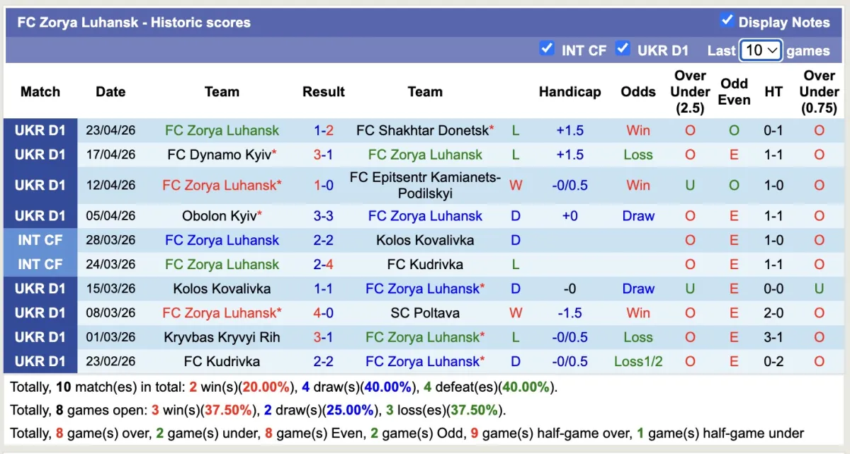 – Thống kê phong độ 10 trận đấu gần nhất của Zorya Luhansk