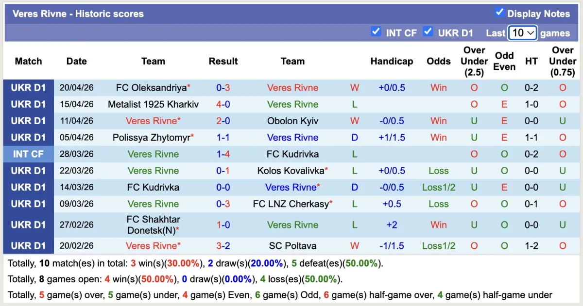 – Thống kê phong độ 10 trận đấu gần nhất của Veres Rivne