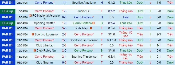 + Cerro Porteno có 1 chiến thắng, 1 trận hòa và 2 thất bại trong 4 trận gần đây theo kèo châu Á.