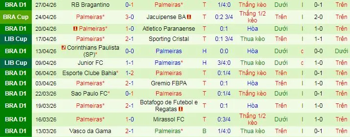 + Palmeiras thắng 5, hòa 4 và thua 2 trong 11 trận vừa qua theo kèo châu Á.