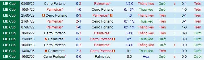 + Cerro Porteno đã thua kèo châu Á cả 5 trận gần đây khi tiếp đón Palmeiras trên sân nhà.