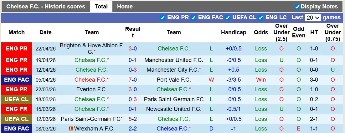Thống kê phong độ 10 trận gần nhất của Chelsea