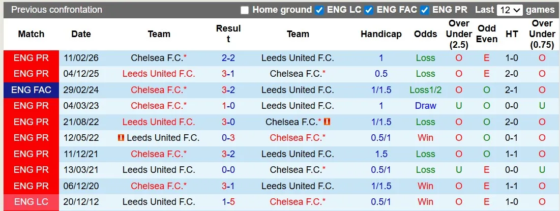 Thống kê phong độ, lịch sử đối đầu của Chelsea đấu vs Leeds