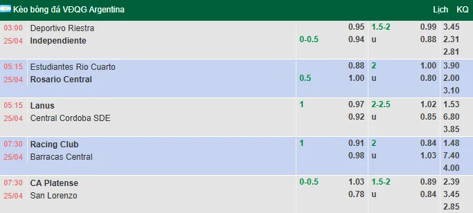 Phân tích trận đấu giữa Estudiantes de Rio Cuarto và Rosario Central sẽ diễn ra vào lúc 05h15 ngày 25/4/2026 trong khuôn khổ giải VĐQG Argentina. Các chuyên gia hàng đầu sẽ đưa ra dự đoán và phân tích tỷ lệ kèo châu Âu, châu Á cho cuộc đối đầu này.