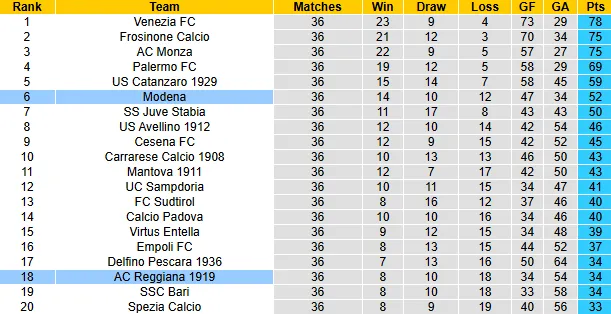 Thống kê phong độ, lịch sử đối đầu Modena vs AC Reggiana
