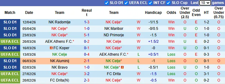 Thống kê phong độ 10 trận gần nhất của NK Celje