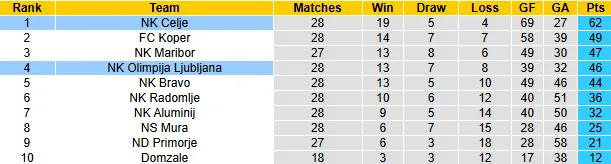 Thống kê phong độ, lịch sử đối đầu NK Celje vs Olimpija Ljubljana