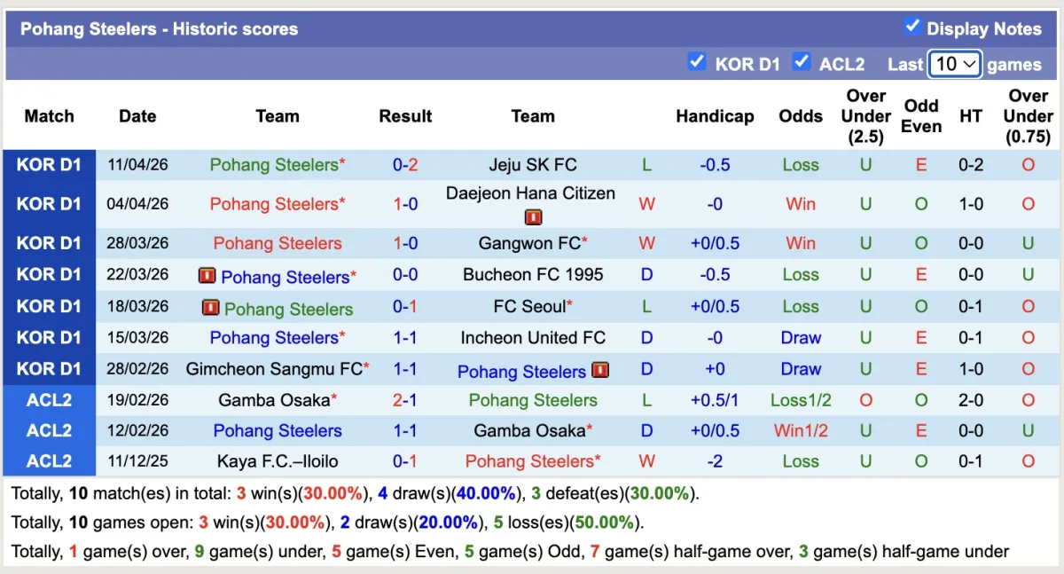 – Thống kê phong độ 10 trận đấu gần đây của Pohang Steelers