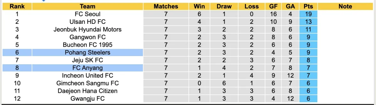 Tuy nhiên, ở mùa giải hiện tại, Anyang đang gặp nhiều khó khăn khi sau 7 vòng đấu, đội bóng này chỉ có được 1 chiến thắng duy nhất, nhưng họ có thể tự an ủi với 4 trận hòa. Hiện tại, đội khách đang đứng thứ 8 với tổng cộng 7 điểm.