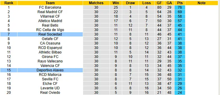 Cần lưu ý thêm rằng đối thủ của họ chỉ là một Alaves thất thường, đội bóng hiện đang đứng ở nửa dưới bảng xếp hạng. Sau 30 trận đã thi đấu, Alaves chỉ giành được 8 chiến thắng, 8 trận hòa và thua tới 14 trận, qua đó đứng ở vị trí thứ 15 trong số 20 đội tham dự. Đặc biệt, Alaves là đội bóng có tâm lý yếu kém khi thi đấu xa nhà. Cụ thể, họ đã thua tới 9 trận và chỉ thắng 2 trong số 13 trận sân khách gần đây tại giải VĐQG Tây Ban Nha.