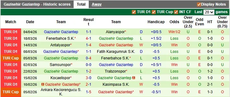 Thống kê phong độ 10 trận đấu gần nhất của Gaziantep
