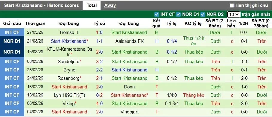 Thống kê phong độ 10 trận đấu gần nhất của IK Start
