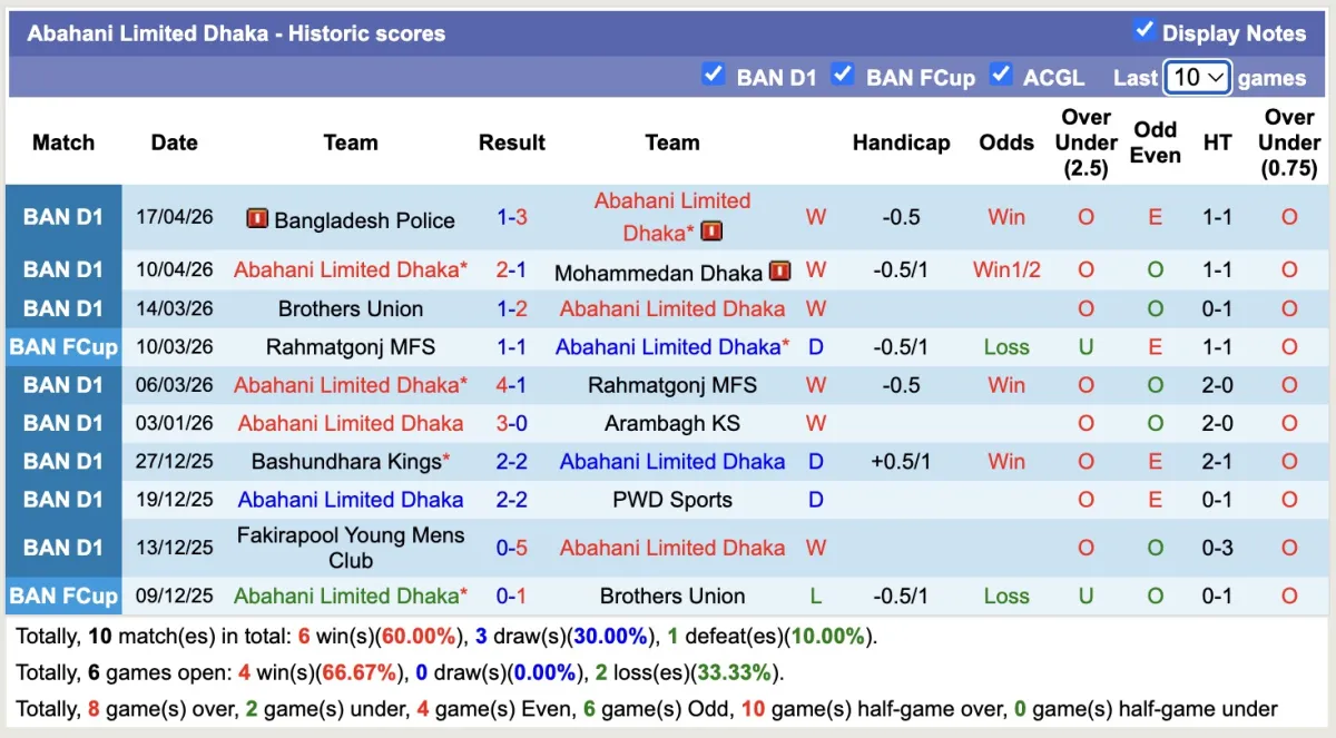 – Thống kê phong độ 10 trận đấu gần nhất của Abahani Limited Dhaka