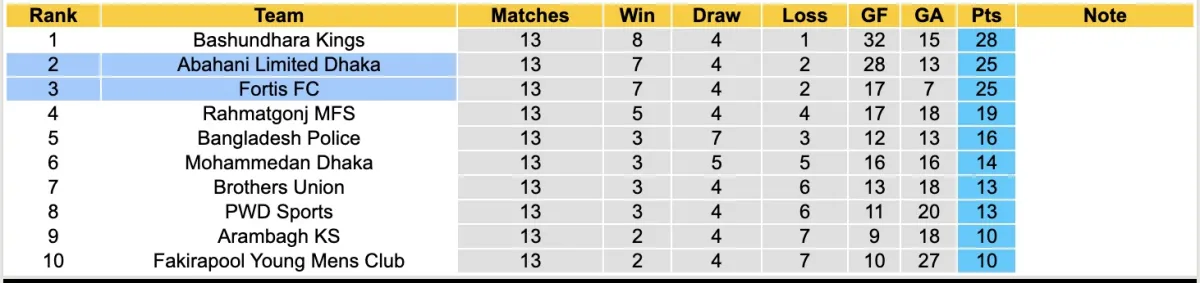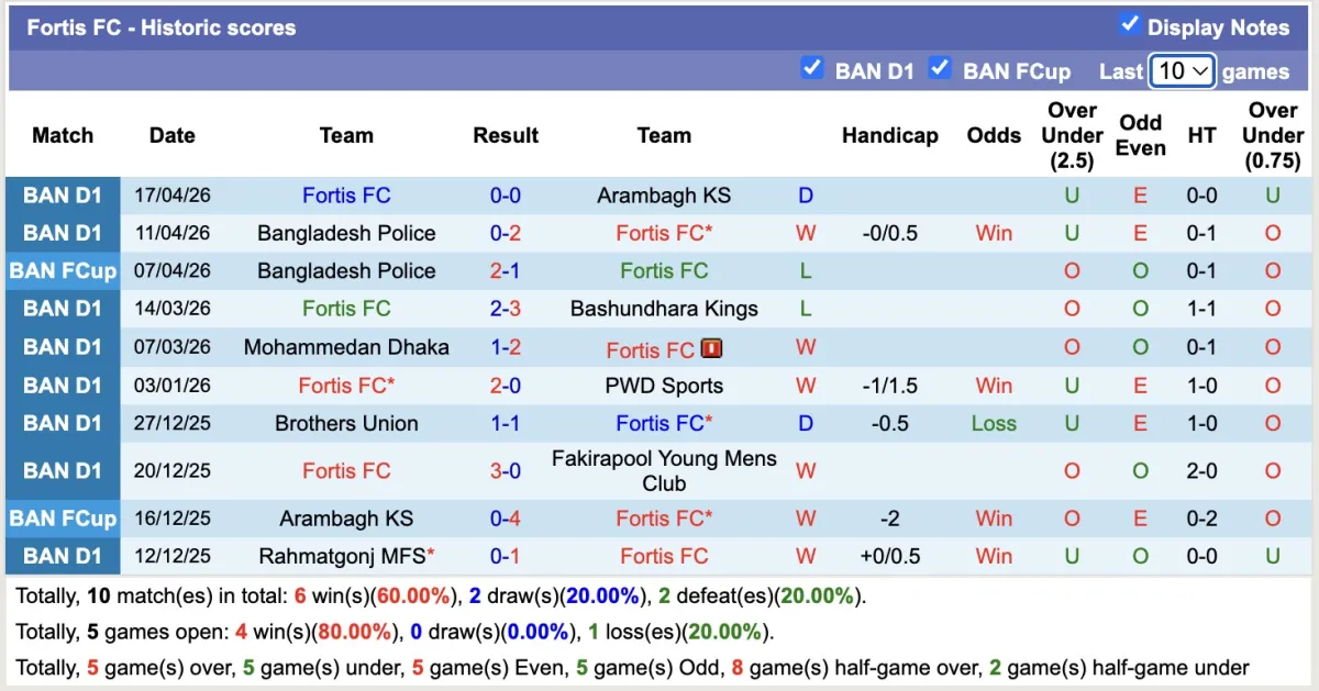 Nếu xét riêng tại giải VĐQG Bangladesh, Fortis có phong độ khá ổn khi sau 13 vòng đấu, họ chỉ thua 2 trận và đạt được 7 chiến thắng. Với 25 điểm hiện có, đội bóng này đang đứng ở vị trí thứ 3, bằng điểm với đội đứng thứ 2 nhưng thua kém về hiệu số.
