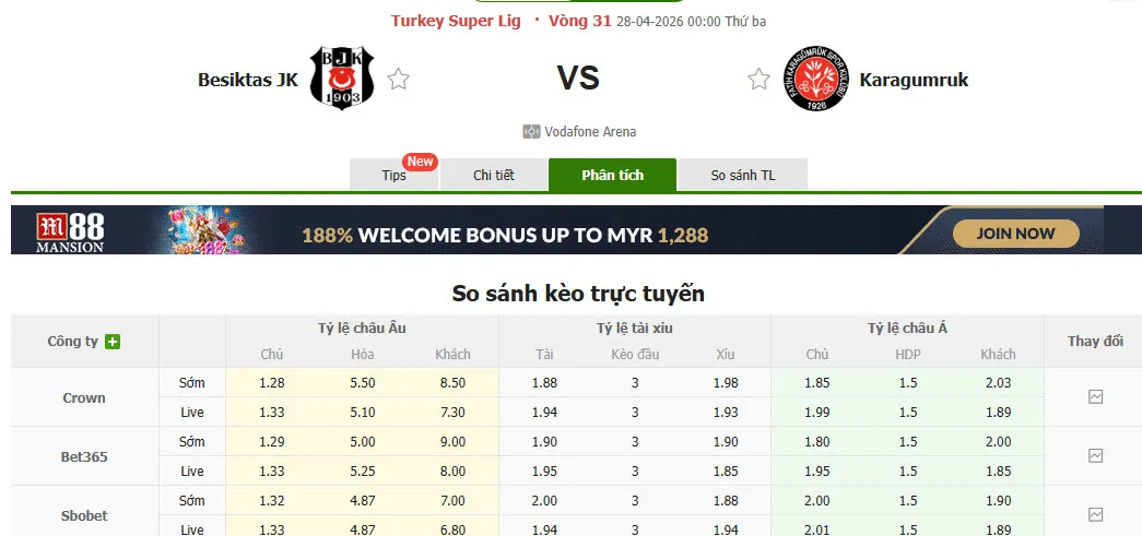 Phân tích và nhận định kèo trận đấu giữa Besiktas và Fatih Karagumruk diễn ra vào lúc 00h00 ngày 28/4 trong khuôn khổ giải VĐQG Thổ Nhĩ Kỳ. Chuyên gia sẽ cung cấp cái nhìn sâu sắc về tỷ lệ kèo, đồng thời dự đoán kết quả của cuộc chạm trán giữa Besiktas và Fatih Karagumruk theo cả tỷ lệ châu Á và châu Âu.