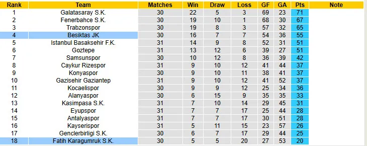 Thống kê phong độ, lịch sử đối đầu của Besiktas vs Fatih Karagumruk