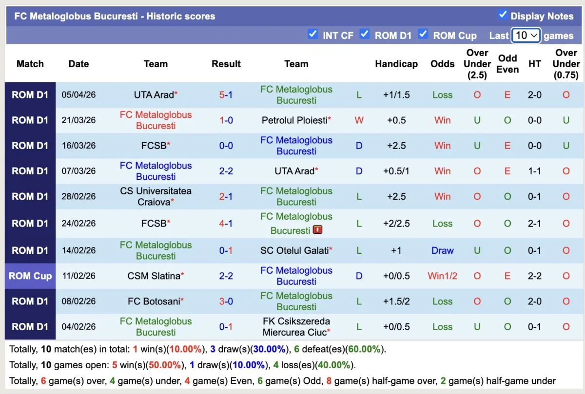 -Thống kê phong độ 10 trận đấu gần nhất của Metaloglobus Bucuresti