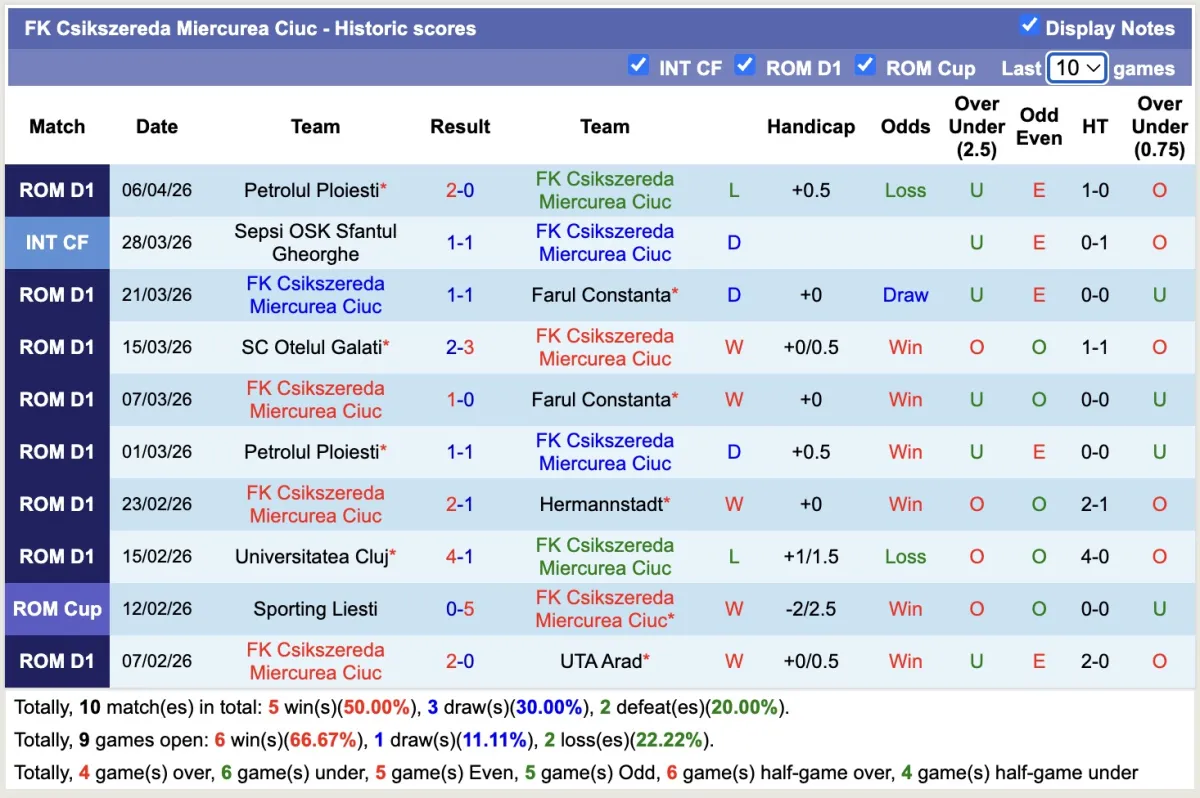 -Thống kê phong độ 10 trận đấu gần nhất của Csikszereda Miercurea Ciuc