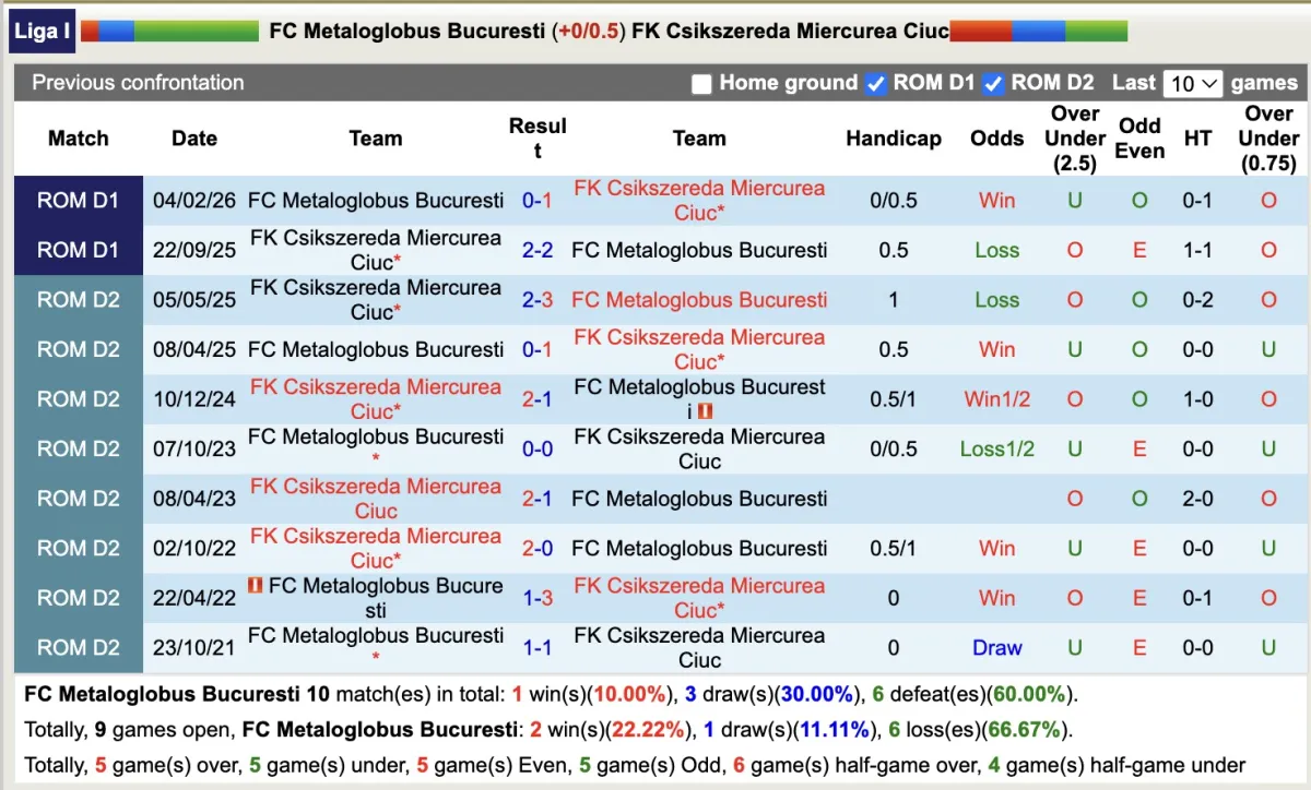 Csikszereda Miercurea Ciuc được nhà cái đánh giá cao hơn mặc dù phải thi đấu trên sân khách. Trong lần gặp nhau gần nhất giữa hai đội vào tháng 2 năm 2026, họ cũng đã thi đấu xa nhà và giành chiến thắng theo kèo. Trong 9 lần đối đầu với Metaloglobus Bucuresti, họ chỉ có 2 trận thắng kèo và 6 trận thua kèo, vì vậy có thể đội khách sẽ là ưu tiên trong trận này.