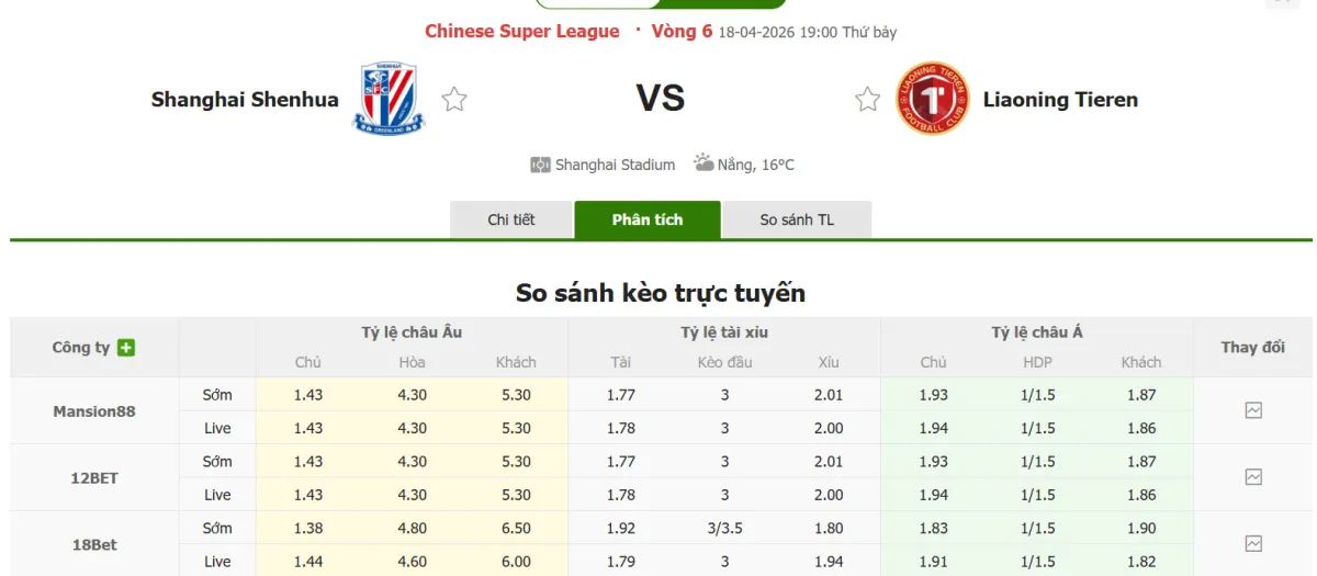 Phân tích và dự đoán tỷ lệ kèo giữa Shanghai Shenhua và Liaoning Tieren diễn ra vào lúc 19h00 ngày 18/4 trong khuôn khổ Giải VĐQG Trung Quốc. Các chuyên gia hàng đầu sẽ đưa ra cái nhìn tổng quan về tỷ lệ kèo châu Âu và châu Á nhằm dự đoán kết quả trận đấu này.