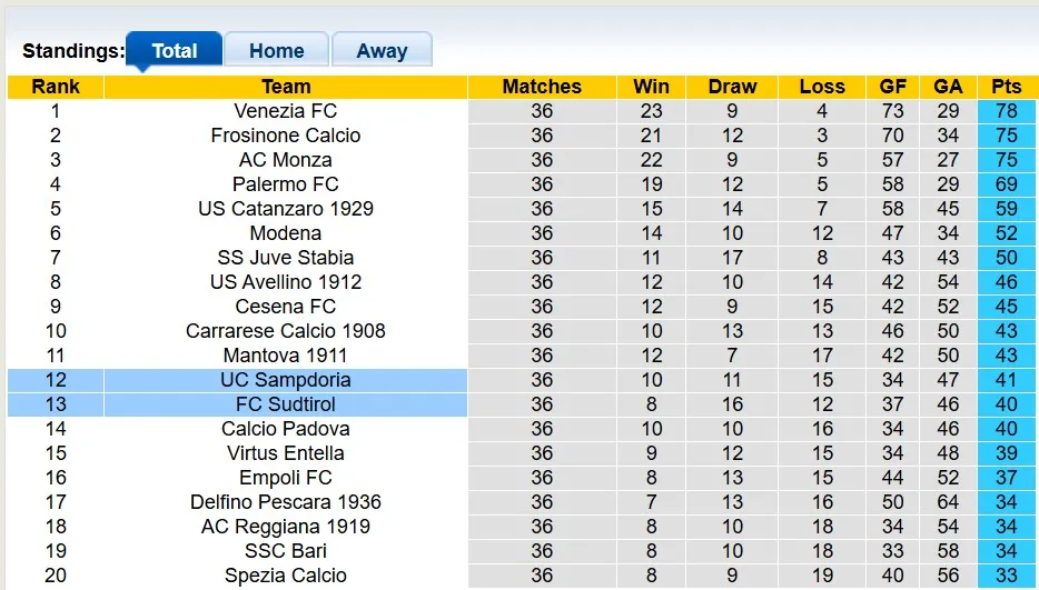 Ở phía bên kia, tình hình của đội khách Sudtirol cũng không khá hơn. Họ đứng ngay sau Sampdoria với 1 điểm ít hơn và hơn 6 điểm so với nhóm xuống hạng. Ngay cả khi Sudtirol thua cả 2 trận cuối, khả năng họ vẫn trụ hạng thành công là rất cao.