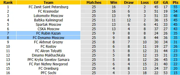 Ở phía đối diện, Rubin Kazan cũng đang duy trì phong độ tốt với chuỗi 6 trận bất bại. Tuy nhiên, khi thi đấu xa nhà, đội bóng của HLV Rashid Rakhimov thường áp dụng lối chơi thực dụng và đặt nặng phòng ngự. Hàng công của Rubin Kazan phụ thuộc nhiều vào sự sáng tạo của Mirlind Daku, nhưng sự thiếu hụt các phương án dự phòng chất lượng có thể gây khó khăn khi họ chạm trán một Dynamo Moscow đầy khát khao.