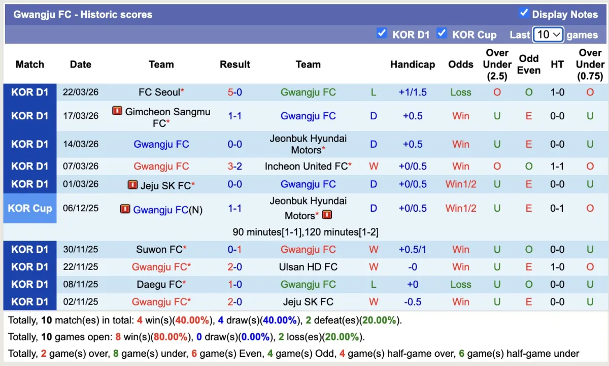 – Thống kê phong độ 10 trận đấu gần nhất của Gwangju